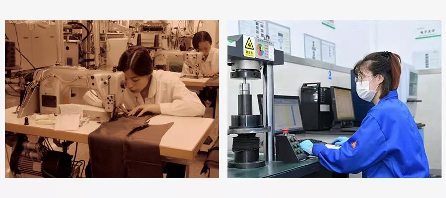 左图:1998年女员工在传统缝纫机前埋头苦干   右图:2019年技术人员在精密设备前从容操作