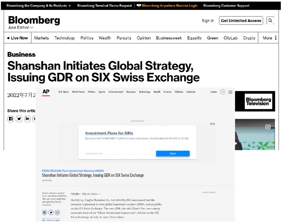 彭博社指出,杉杉股份成功申请发行GDR并在瑞士证券交易所上市,是中国新能源产业首批“中瑞通”,对于进一步拓宽海外融资渠道,开拓海外市场,实现全球化战略,极具创新意义。